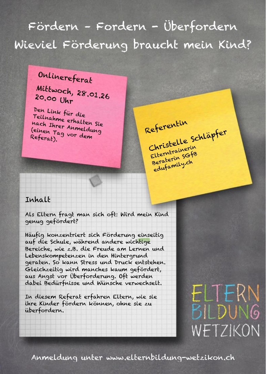 | 28.01.2026 | Wetzikon (online) | Fördern, Fordern, Überfordern: Wie viel Förderung braucht mein Kind? | Eltern |